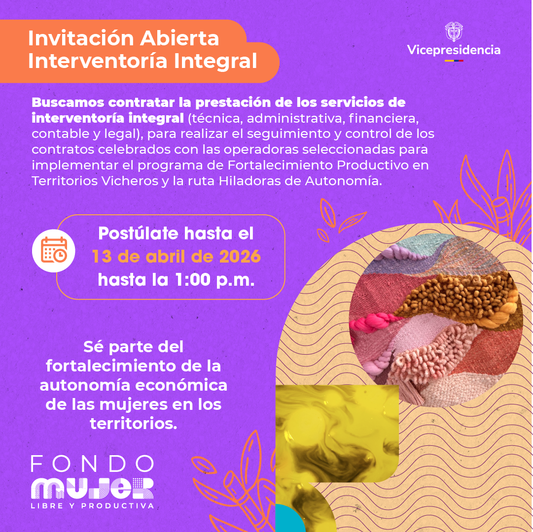 El Fondo Mujer Libre y Productiva busca contratar la prestación de los servicios de interventoría integral (técnica, administrativa, financiera, contable y legal), para realizar el seguimiento y control de los contratos celebrados con las operadoras seleccionadas para implementar el programa de Fortalecimiento Productivo en Territorios Vicheros y la Ruta Hiladoras de Autonomía.